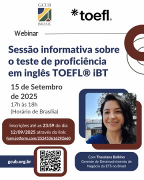 No âmbito do Acordo de Cooperação assinado entre o GCUB e a Educational Testing Service (ETS - organização responsável pelos exames TOEFL® iBT em todo o mundo), será realizado neste mês de Setembro um Webinar informativo para esclarecer todas as dúvidas relativas ao teste.